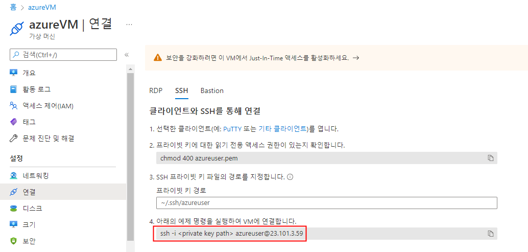 ssh -i {인증서파일경로} {아이디}@{VM IP주소}