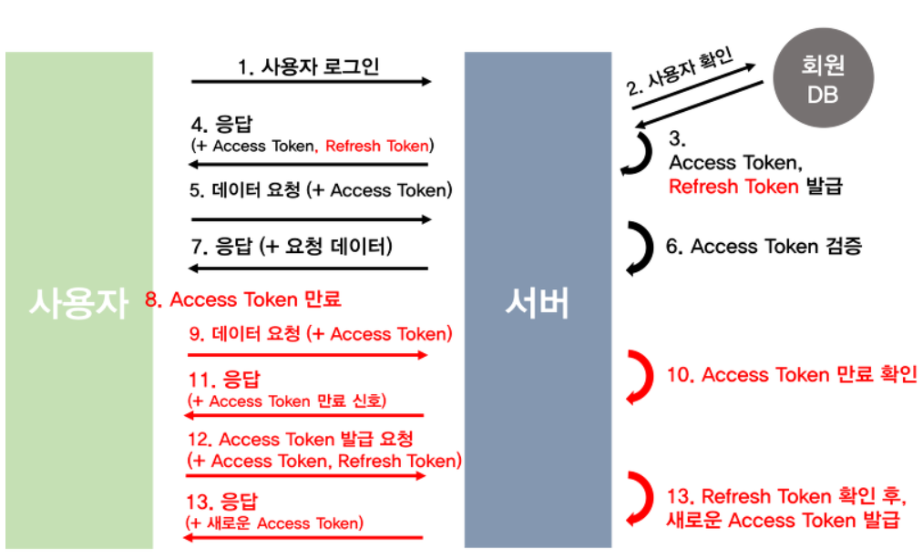 * access token의 유효기간은 짧게(ex_1시간), refresh token의 유효기간은 적당히(ex_2주)