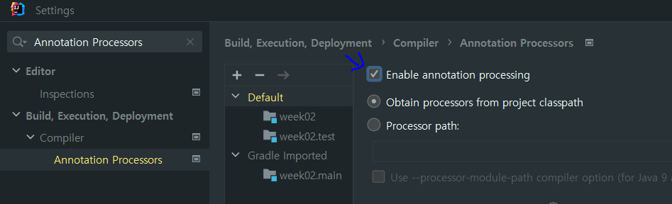 - 검색창에 "Annotation Processors" 입력 후, 우측 "Enable ~" 체크하고 OK 클릭