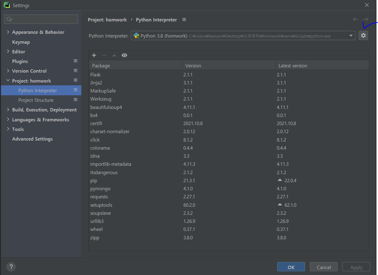 2. Project:[프로젝트이름] > Project Interpreter 가셔서 project interpreter 옆에 톱니바퀴 > add... 해서 새로 가상환경을 만들어주세요!