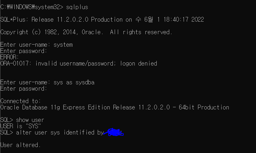 6. alter user sys identified by {비밀번호} 입력