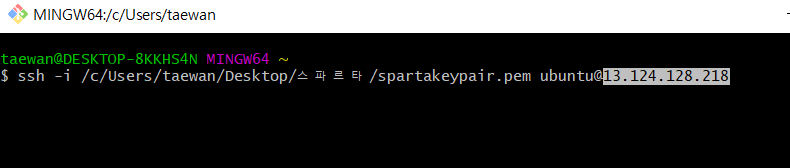 ssh -i '/c/Users/taewan/Desktop/스파르타/ubuntu명령어 세팅 파일/spartakeypair.pem' ubuntu@13.124.128.218