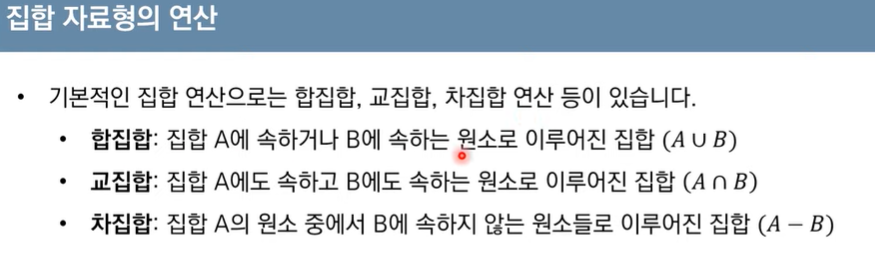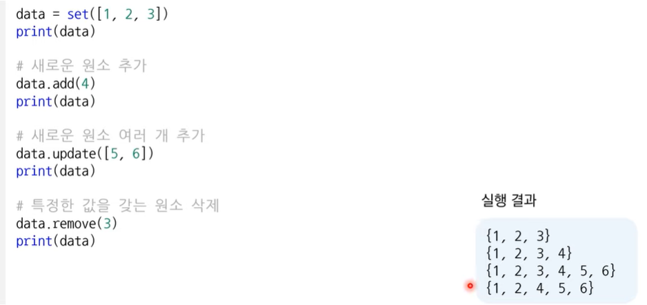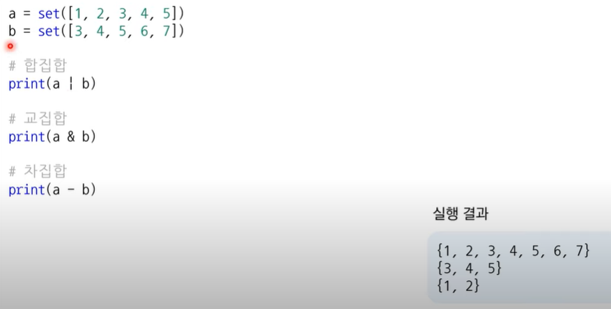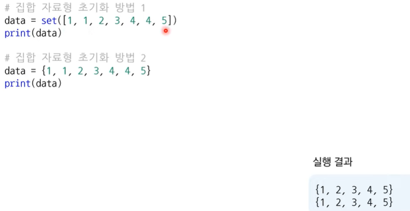 - 집합은 리스트 혹은 문자열을 이용해서 초기화할 수 있습니다. - set 함수 이용