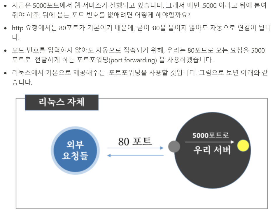 80포트로 들어오는 요청을 5000포트로 넘겨주는 명령어
