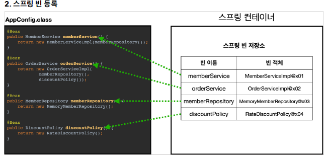 - 스프링 컨테이너는 싱글톤 컨테이너 역할을 한다. 이렇게 싱글톤 객체를 생성하고 관리하는 기능을 싱글톤 레지스트리라 한다.