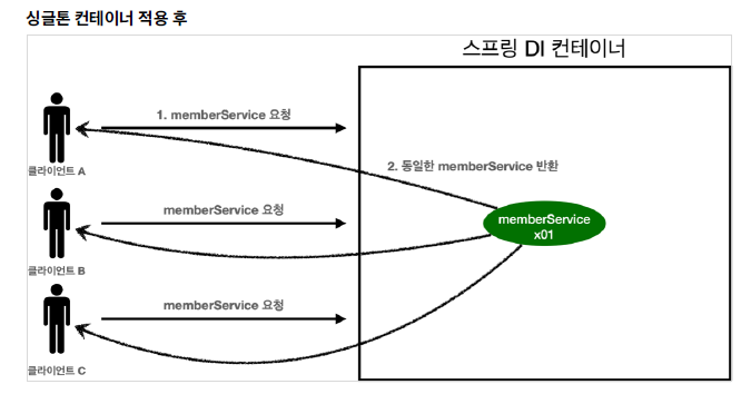 - 스프링 컨테이너는 싱글톤 패턴의 문제점을 해결하면서, 객체 인스턴스를 싱글톤(1개만 생성)으로 관리한다.
