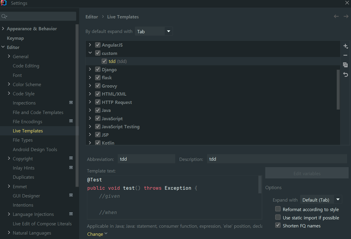 자동완성 세팅 -> Live templates -> custom 폴더 생성 -> tdd 생성