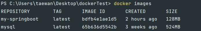 docker images 명령어 입력 후 Repositoy = 이미지명 , 태그 = latest , ntw2100/my-repo:latest (도커 허브 레파지토리)