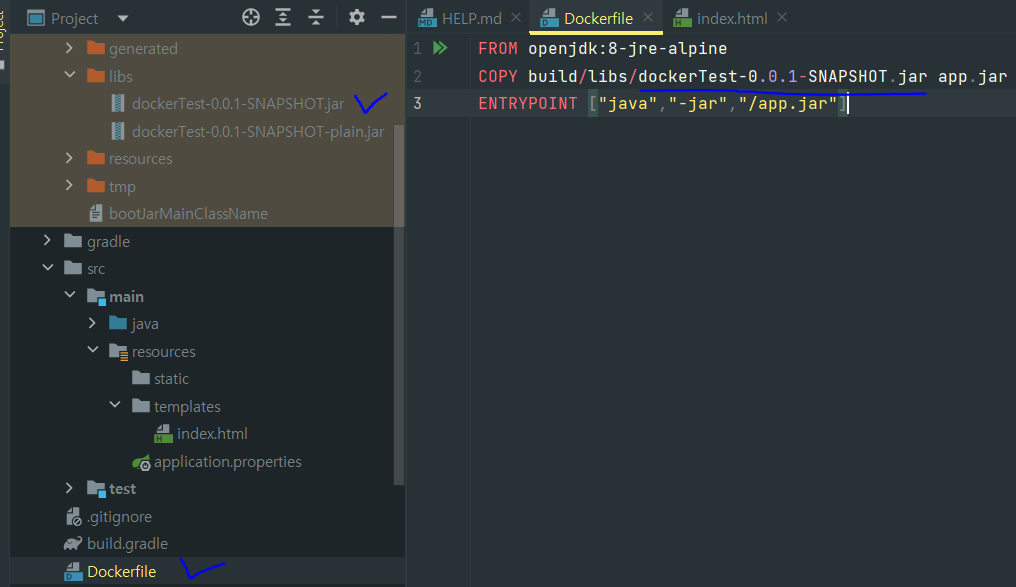 COPY <= 파란색 밑줄 부분과 빌드 파일에 있는 .jar 파일 명의 이름이 같아야한다.