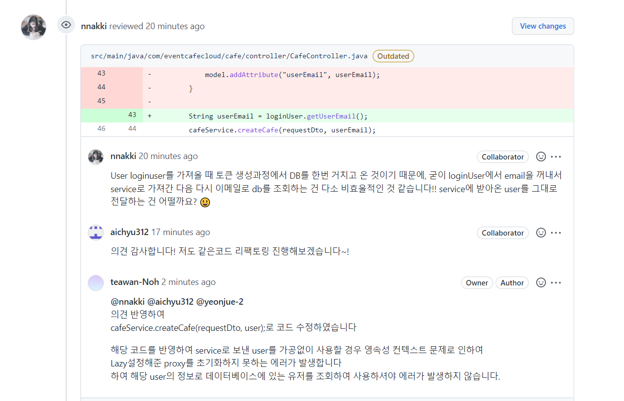 코드리뷰 내용을 바탕으로 리팩토링 진행 -> 카페 생성 코드 테스트 진행