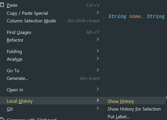 이때 인텔리제이에서 코드 부분에 우클릭을 하면 Local Histrory라는 배너가 보일것입니다.