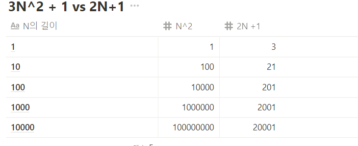 💡 즉, 2N+1의 연산량이 나온 첫번째 풀이 방법은 N 만큼의 연산량이 필요하다 N^2 의 연산량이 나온 두번째 풀이 방법은 N^2 만큼의 연산량이 필요하다.