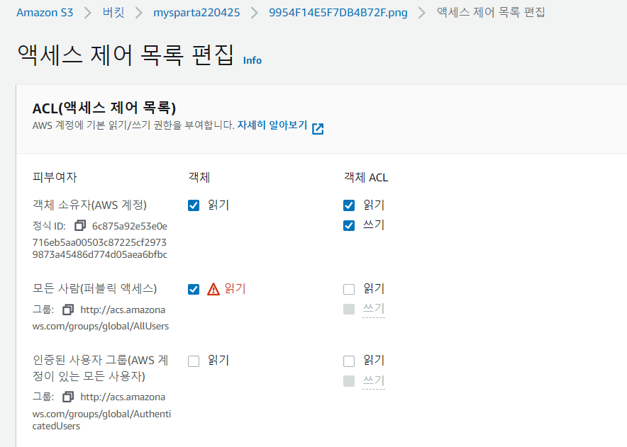 - 버킷을 1개 만든 후 각 파일마다 권한 설정