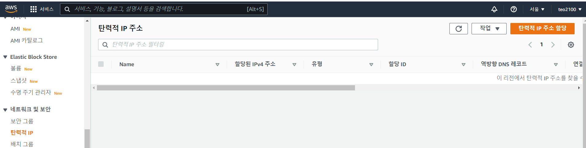 - 새로운 ip가 할당되지 않고 고정된 아이피를 사용하고 싶을 경우 탄력적 IP 할당