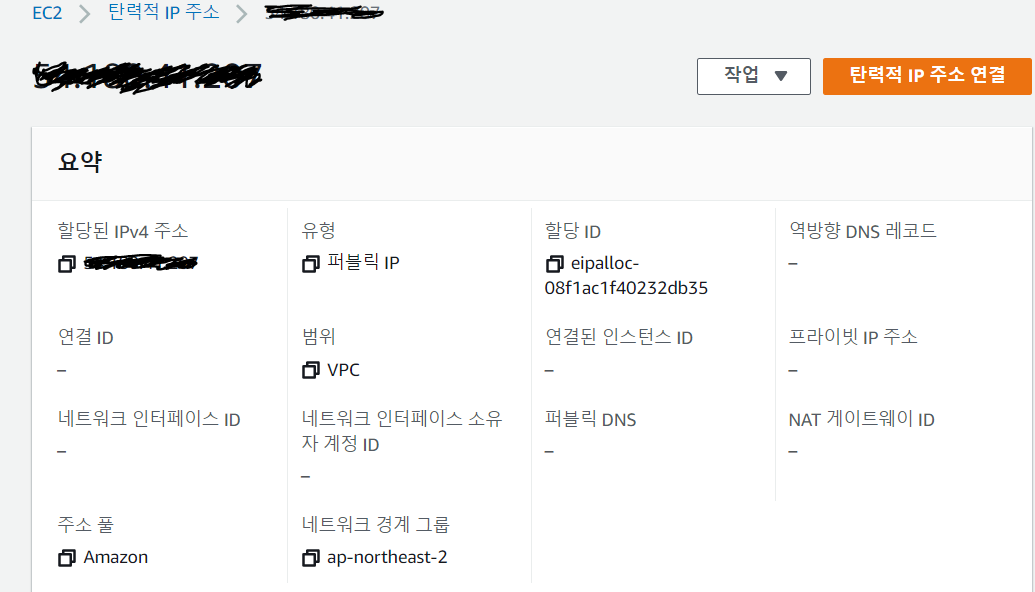 * 할당 받은 탄력적IP를 인스턴스와 연결한 후 탄력적 IP를 재발급 받아 다른 인스턴스에 연결 시킬 수 있다.