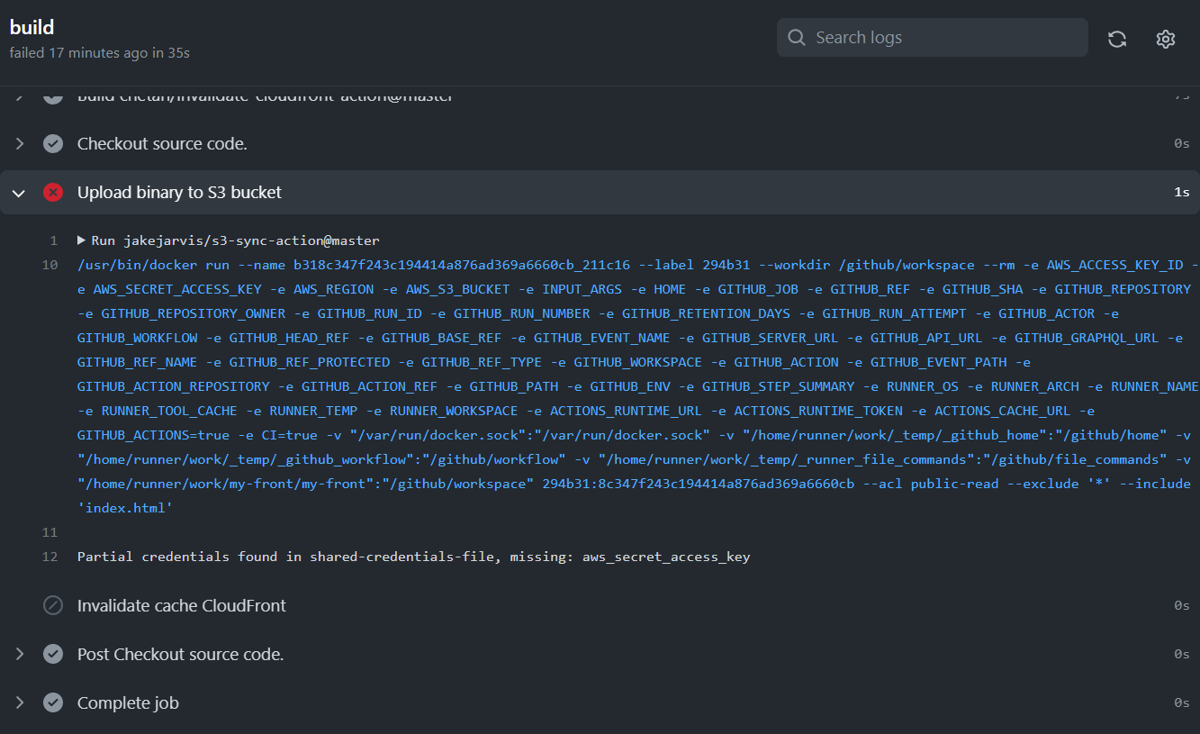 1. 상황 : 자동배포 설정 중 aws_secret_access_key가 missing 되었다는 에러 발생
