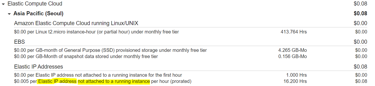 탄력적 IP를 발급받은 상태에서 인스턴스와 연결되어 있지 않으면 요금이 부과됩니다.