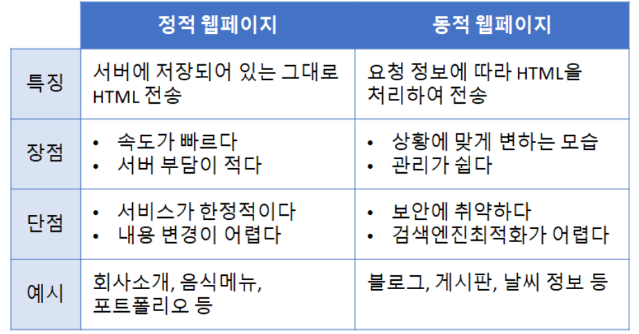 - 정적 웹페이지는 추가적인 통신&계산이 필요 없기 때문에 속도가 빠르고 서버에 부담이 적은 반면, 추가/수정/삭제 등 내용 변경이 필요할 때 HTML 자체를 수정해야 하기 때문에 번거롭다는 단점이 있습니다.